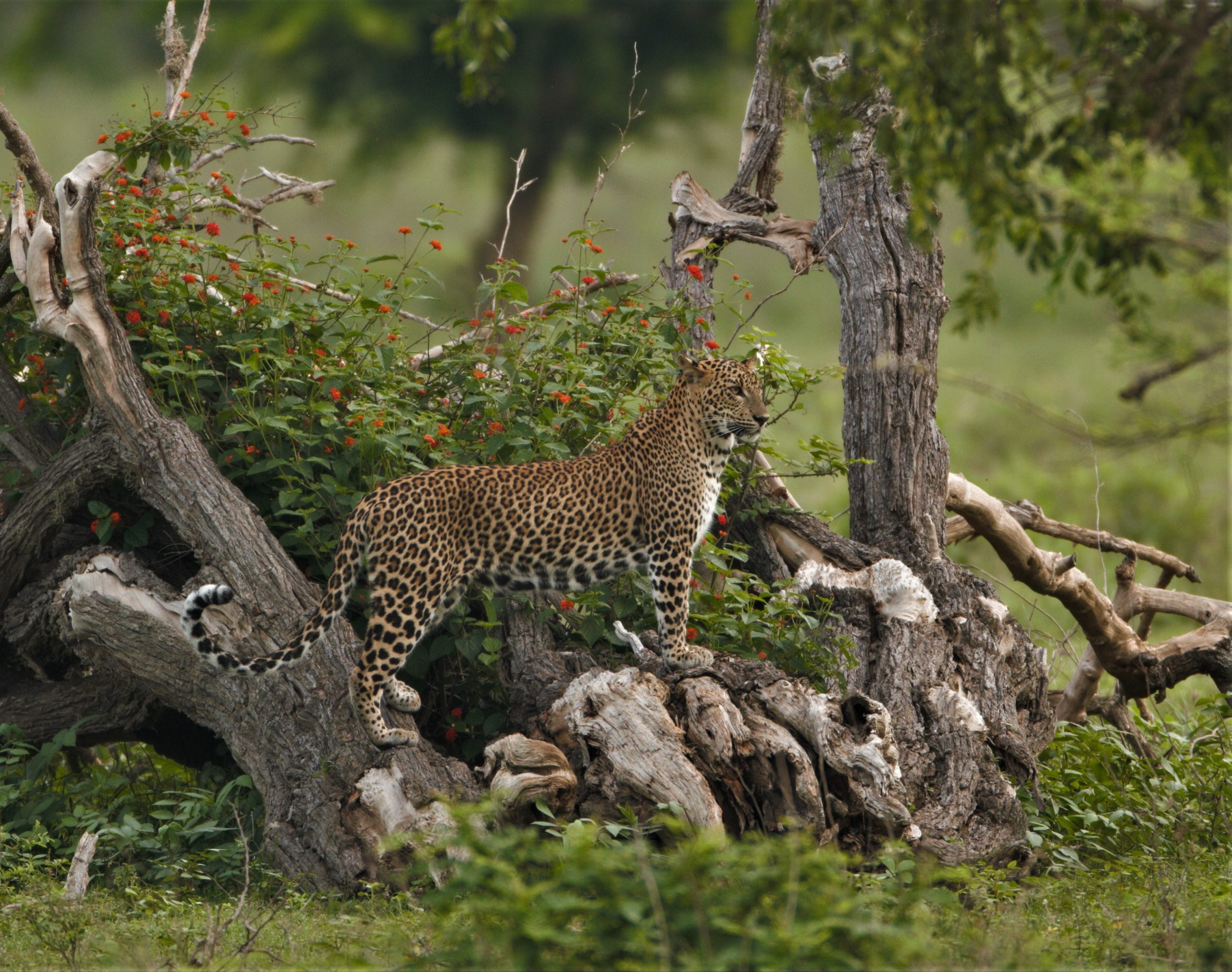 Welmalkema 4:4 female is a well-known leopard among the safari community, due to her coolness towards jeeps. This behavior is the polar opposite of her mother, the Welmalkema 4:3 female. In 2020, she was seen several times with the Kaluwara Bōkkuwa 2:3 around Welmalkema and adjacent areas.